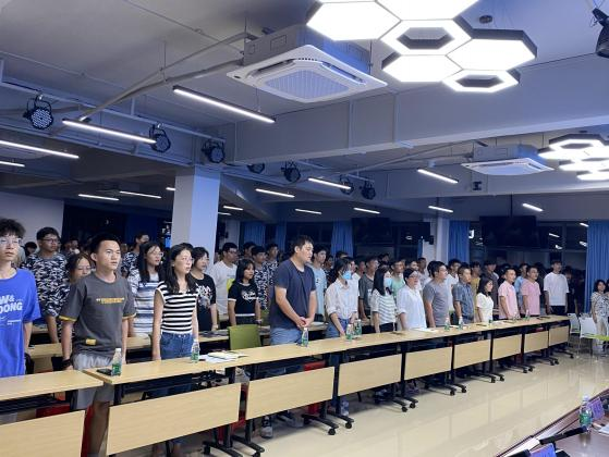 在激昂的国歌声中,化学工程学院2023级新生入学教育大会拉开帷幕。全体师生行注目礼,唱国歌。
