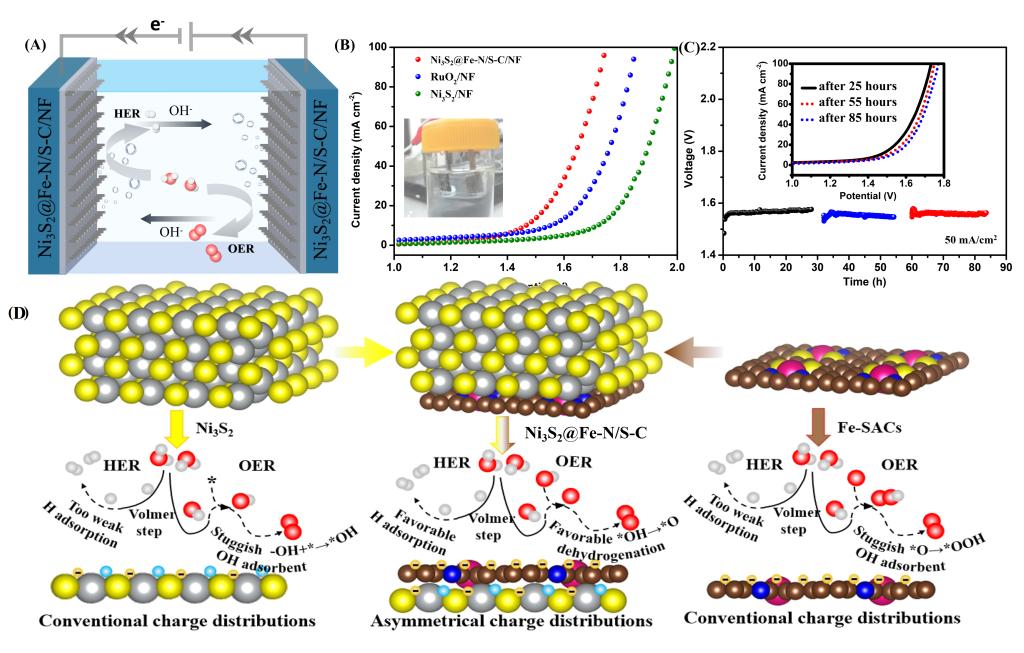 在这项工作中,研究人员通过结合界面工程和掺杂工程,发明了一步气相化学气相沉积(CVD)技术,制备了一种新颖的单原子铁(Fe)掺杂的碳包覆镍硫化物(Ni3S2)核心-壳量子线阵列(Ni3S2@Fe-SACs)电催化剂。该催化剂展现出了极高的电解水产氢的性能。在1 m KOH溶液中,HER和OER的过电位分别为46 mV和219 mV的优异电催化性能。此外,由Ni3S2@Fe-SACs组装的双电极电解槽在实现10 mA cm−2的碱性整体水分解时,仅需1.465 V的低电压。这种材料的设计充分考虑了材料的电子结构和界面电子转移调控,达到催化过程中的瞬态和氢/氧中间体的吸附能的最佳调控。