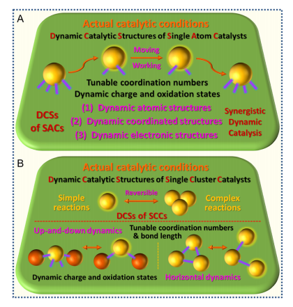 当前“单原子催化剂(SACs)”和“单簇催化剂”(SCCs,如三原子团簇和多原子团簇)成为绿色石油化工和精细化工催化领域的研究热点。“单原子催化剂”和“单簇催化剂”由于具有连续的金属活性位点和完全暴露的原子结构,能表现出独特的协同效应和催化活性。在实际催化反应过程中,“单原子催化剂”和“单簇催化剂”都经历着几何结构和电子结构的动态变化过程。如何从原子水平的动态结构演化角度,理解真正催化反应过程中的反应机理和催化剂的稳定性是具有挑战性的。在本论文中,作者提出了一个崭新的“动态催化结构”新概念,用来解释理解在多相催化领域中的SACs和SCCs发生的动态现象。“动态催化结构”新概念包含了动态原子结构、动态配位结构、动态电子结构。“动态催化结构”的提出具有重要科学意义,可以广泛应用在单原子催化中的热催化、光催化和电催化领域中。这一研究概念的提出,不仅在单原子催化理论上取得了突破,而且为单原子催化的应用和发展提出了新的思路和见解,为未来设计单原子催化剂提供了重要的参考。