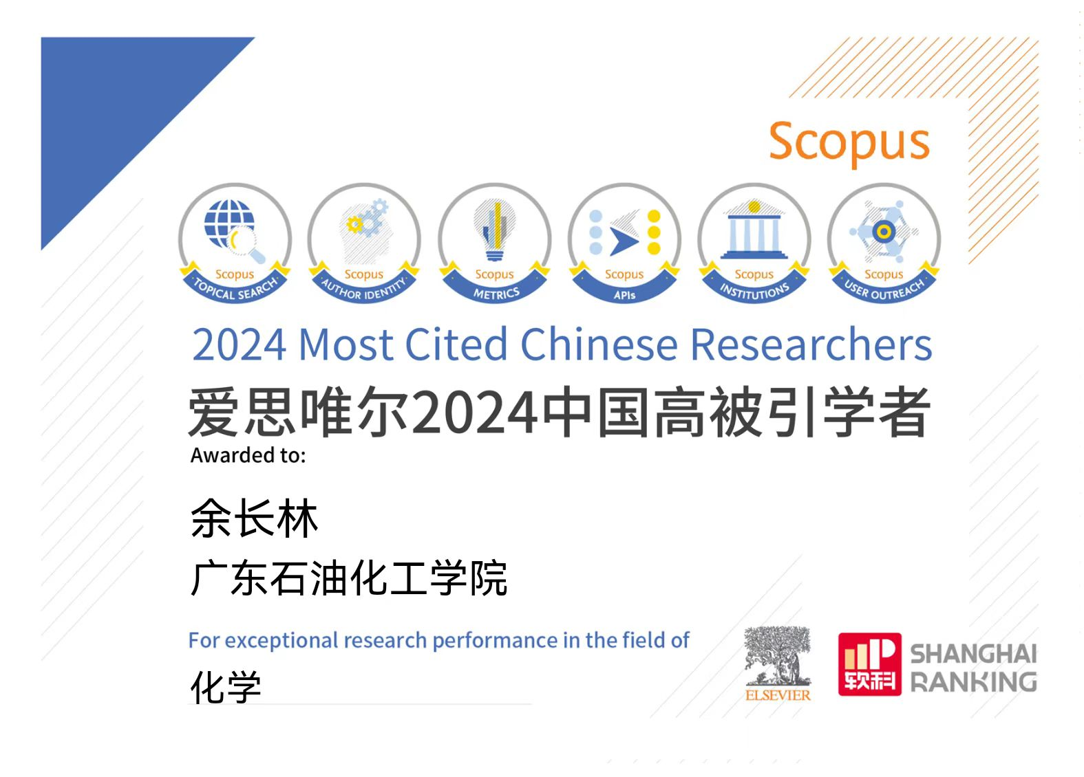 3月25日,爱思唯尔(Elsevier) 发布2024“中国高被引学者”(Highly Cited Chinese Researchers)榜单,我院余长林教授荣登化学学科榜单,其已连续4年入选该榜单。