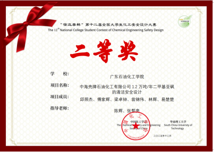 近日,“信立泰杯”第十二届全国大学生化工安全设计大赛落下帷幕,经过7个多月的艰苦努力和奋力拼搏,由陈辉教授、张帮亮和黄燕青老师指导的两支队均获奖。两个团队成员分别由化学工程学院、能源动力学院学生组成,他们是⻘硫素氧团队(成员:邱照杰、傅家辉、梁卓钟、翁锦伟、林辉、易楚楚)获二等奖,安全合砜团队(胡城玮、刘家宝、陈志轩、刘永辉、张艺钒、王成崧)获优胜奖。