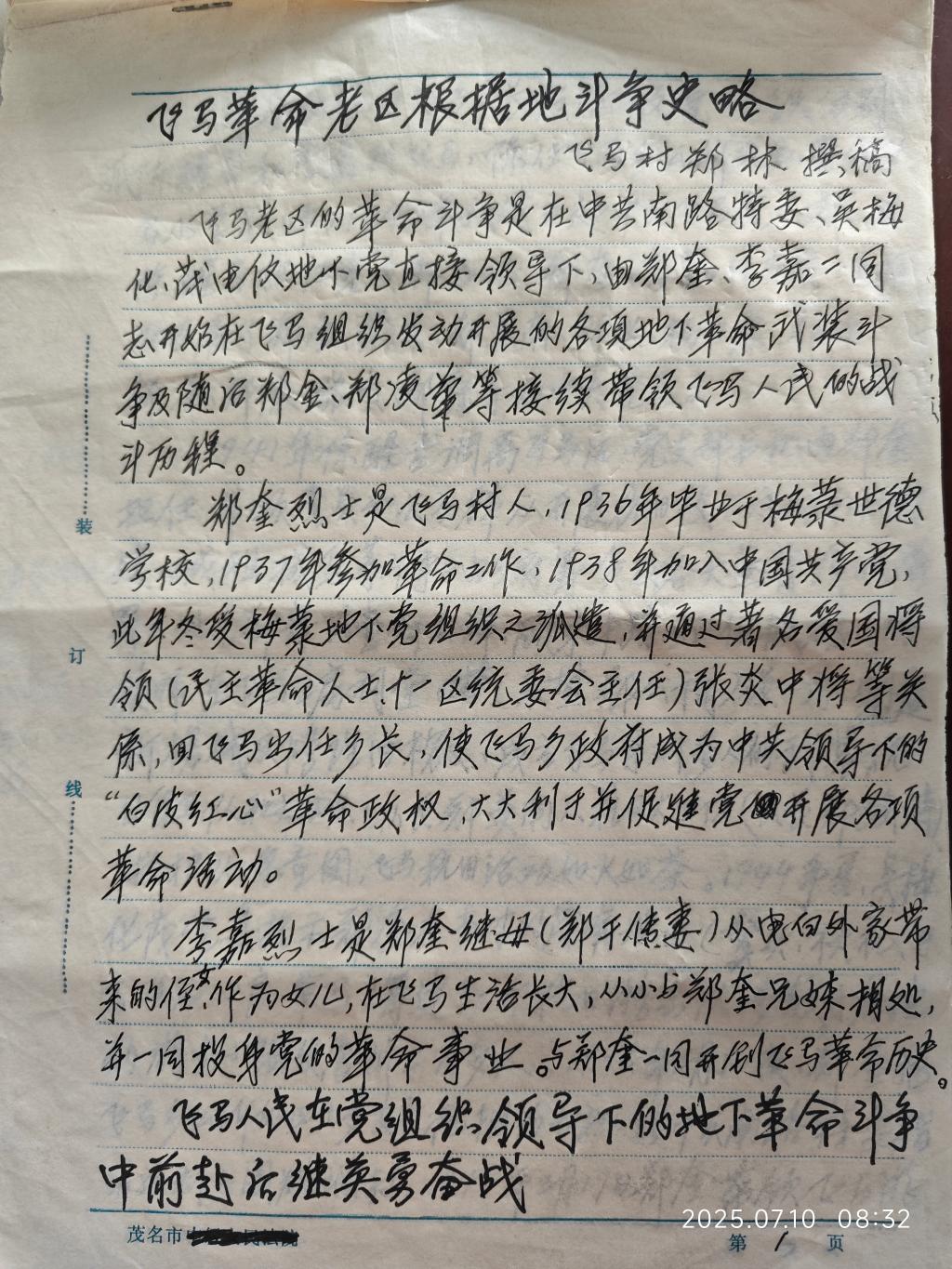 《飞马革命老区根据地斗争史略》手写稿