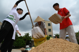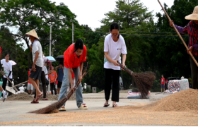 又是一年丰收时,金色的稻浪在夏风中翻滚。追光盛夏实践团的队员们走进田间,与乡亲们一起收谷、扬谷、装袋。汗水流淌,丰收的喜悦写在脸上,助农的担当扛在肩上。晒场上烈日当空,队员们的扫帚划过地面,木耙轻拢花生,仿佛在梳理着大地的馈赠。一铲一铲,花生被装进麻袋,沉甸甸的,不仅是果实,更是青春的热忱与奉献。