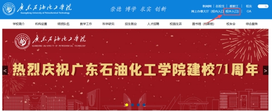 1.打开学校官方网站。校外用户点击“网上办事大厅—校外入口”进行登录。校内用户则点击“校内入口”登录。