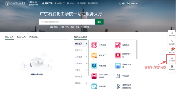 4.若想浏览学校主页通知公告或者部门(学院)网站主页,可点击右边学校官网图标跳转回学校主页。