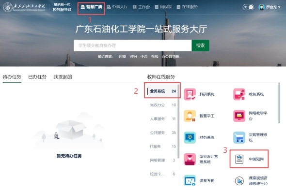 3.登录成功后,进入办事大厅,即可选择对应业务系统访问(如:财务系统、采购系统、中国知网等)。